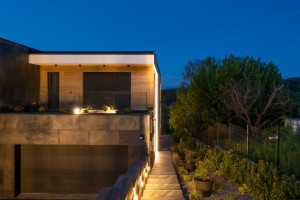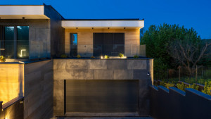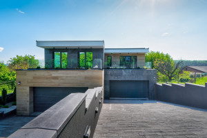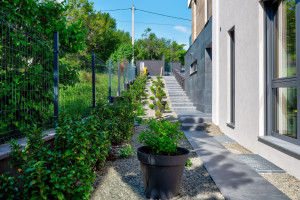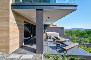 A külső megjelenés minimalista, mégis karakteres: a homlokzatot fekete kőfurnér és fahatású kerámialapok alkotnak elegáns kontrasztot, a rejtett üvegkorlátok pedig még inkább kiemelik a kortárs architektúrát.
