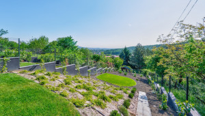 A kert öntözőrendszerrel, locsolómérővel, ültetett növényekkel és alacsony támfalakkal lett kialakítva – rendezett, mégis természetközeli összhatással.