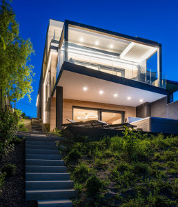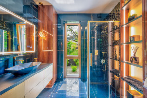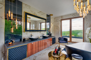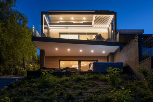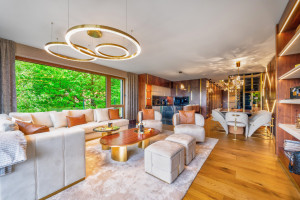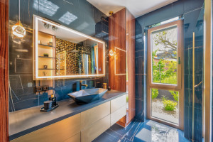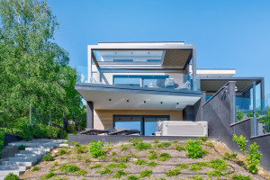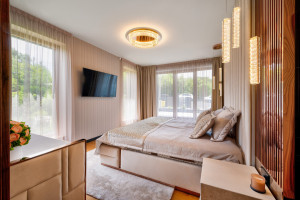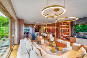 A 734 nm-es, gondosan kialakított lépcsőzetes telken álló ház minden négyzetmétere az igényességet és a minőséget tükrözi — a minőségi faburkolatoktól a mennyezetig érő ajtókig, a kristálycsillároktól a legapróbb, funkcionális részletekig.