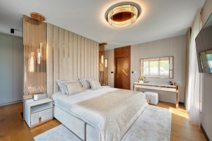 A ház 5 szobával, 4 fürdőszobával + gardróbokkal,háztartási helyiség, wellness- és konditeremrészleggel rendelkezik.