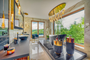 A legalsó szinten lévő wellnessrészlegben TechnoGym konditerem és Caldera Spa jakuzzi (önsózó, LED-világítással) teszi teljessé az otthoni pihenést és feltöltődést (itt padlófűtés, klíma és közvetlen kertkapcsolat van).