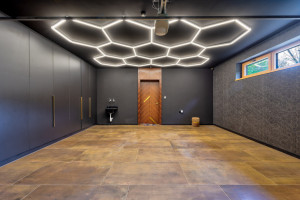 A 40 nm-es dupla garázs önmagában is designélmény: fekete festett falak, Lamborghini tapéta, méhsejtmintás LED-világítás, beépített szekrények és elektromos autótöltő emelik ki az átlagból.